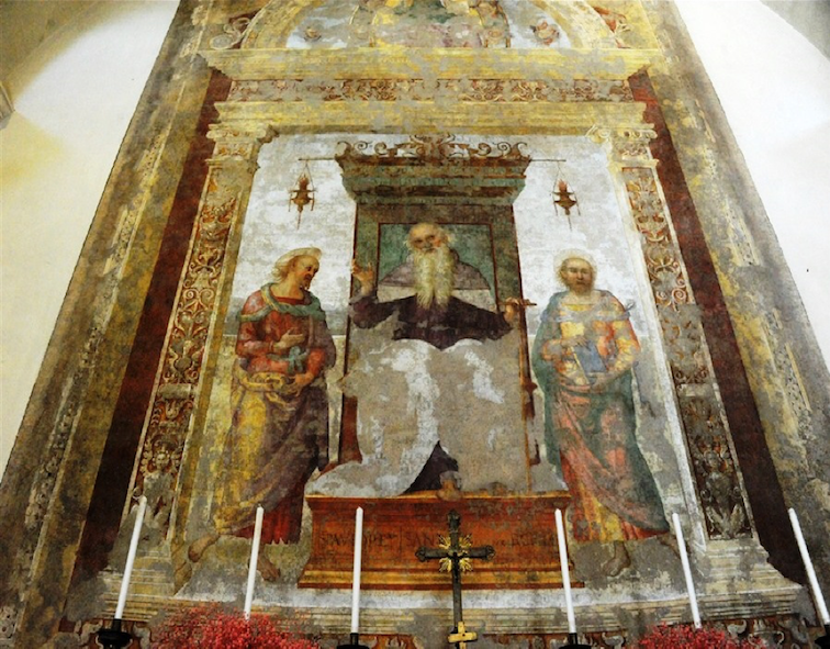 The interior is characterized by a cross-vaulted central bay between two narrow opening and closing bays of the hall, which are barrel-vaulted. The Society of the Disciplinati of the Holy Saviour is credited with a series of important interventions made in 1508 on the place of worship, including the commission to Pietro Vannucci, known as Perugino, of one of his last frescoes, Saint Anthony Abbot between Saints Paul the Hermit and Marcellus, located behind the high altar.