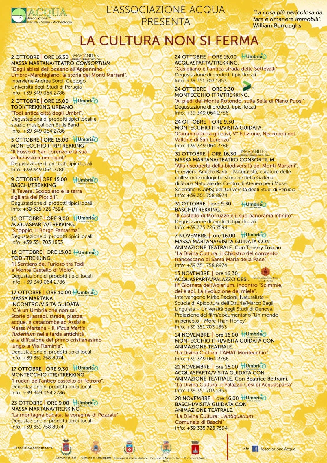Un ricco programma di iniziative, tra ottobre e novembre, con incontri, escursioni e visite guidate tra storia e natura in compagnia dell'Associazione Acqua. Un viaggio in diverse località dell’Umbria, da Acquasparta a Massa Martana, da Baschi a Montecchio, da Todi a Monte Castello di Vibio, passando dal Parco Fluviale del Tevere, alla scoperta di borghi, visuali panoramiche, siti storico-archeologici, ambienti naturali e borghi fantasma.