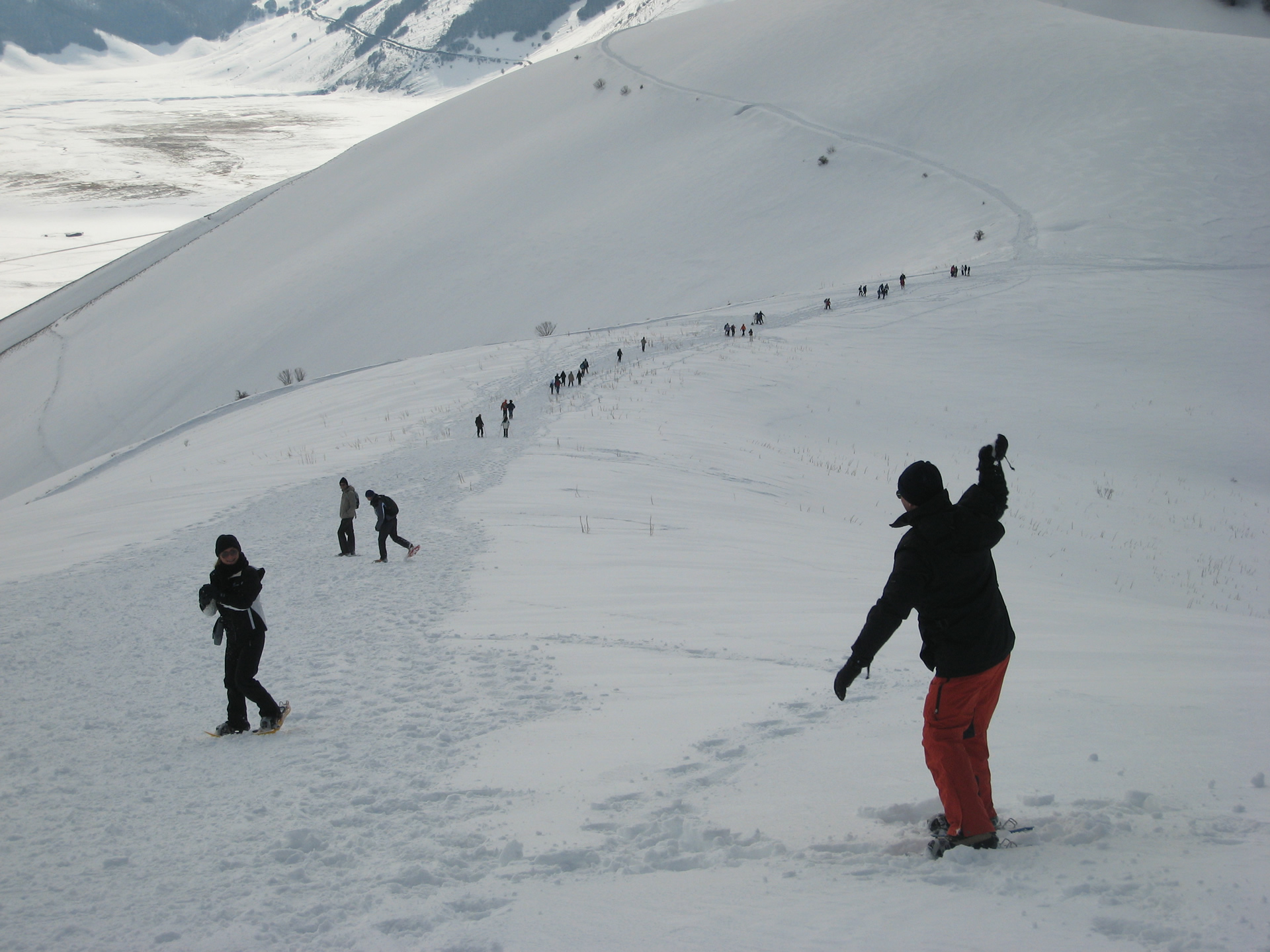 The most suitable area in Umbria to try out this experience is the area of Parco Nazionale dei Monti Sibillini near Castelluccio di Norcia. The Piana di Castelluccio, beautiful and enchanting not only during the ‘fiorita' (flowering) in summer, is frequently covered with snow (the plain is at circa 1350 metres above sea level) as is the adjacent Monte Vettore. The temperatures in winter are very cold and can even reach -30 degrees centigrade. These ideal conditions ensure there are heavy snowfalls, creating fantastic expanses suitable for snowshoe hiking. In this area you can choose between various trails and snowshoe hiking experiences, which will allow you to discover corners of the plain, or follow specific circular routes that surround the mountains.
