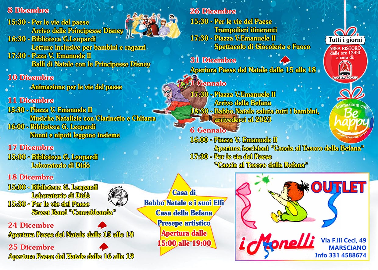 E ancora le vie del borgo si animeranno di musica e spettacoli circensi, insieme a laboratori e letture in biblioteca per i più piccoli, senza dimenticare l’Arrivo della Befana il 1 Gennaio e la Caccia al tesoro della Befana il 6 Gennaio.