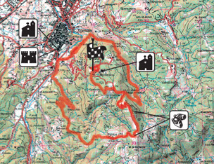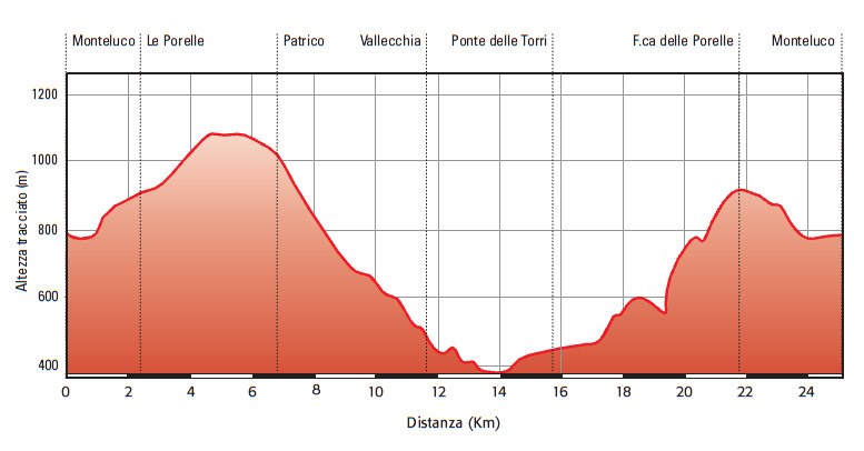 Al chilometro 17,2 svoltate a destra seguendo sempre il sentiero n. 3 che, però, in questo tratto si fa più ripido e impegnativo e scorre sempre tra una fitta vegetazione. Al chilometro 19,6 svoltate a destra lasciando il sentiero n. 3 e seguite le indicazioni (frecce arancioni) per il percorso MTB n. 4 iniziando il tratto più impervio e difficile dell'itinerario. Pedalando prima su uno sterrato molto ripido che può costringere anche a scendere; proseguendo poi su uno stretto e ripido single track avvolto dalla vegetazione che per diversi tratti costringerà a salire a piedi, si arriva sulla strada asfaltata che da Patrico conduce a Monteluco al chilometro 21,8. Da qui, terminato il tratto più impegnativo, potete tornare al punto di partenza ripercorrendo il percorso fatto all'inizio dell'itinerario.